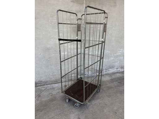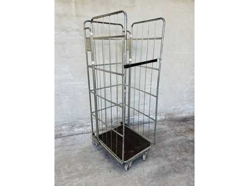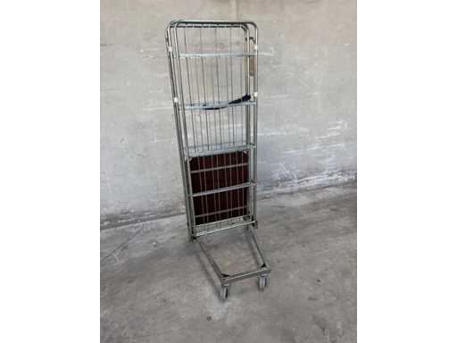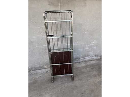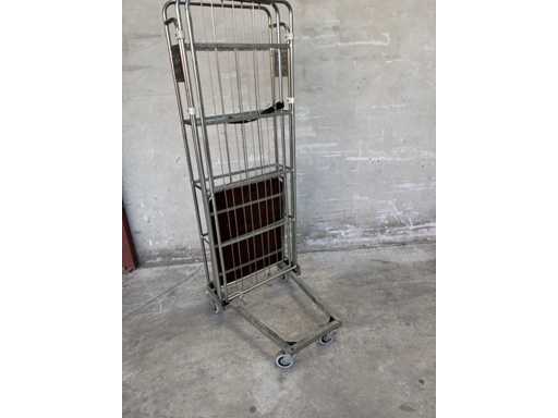 (x1) Metal trolley / Roll caster for transporting goods; 190x80x70cm; 2 directional wheels at the front. Fold-down tray and resealable rack for storage. Holding strap for transport. Material already used. Functional.