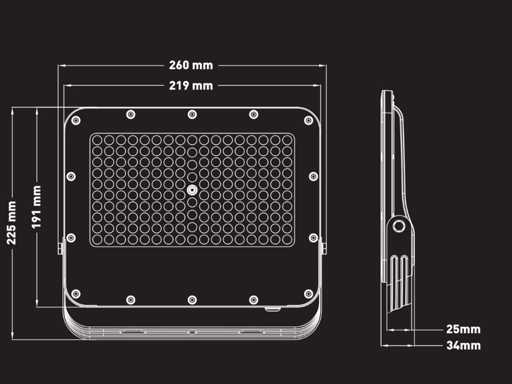 luminous flux 9400 lumens, light color warm white 3000K, sealing IP65, radiation angle 90°, product color sand black, size 260 x 191 x 34mm, material aluminum and PC lens, with lens precise light beams without waste for maximum brightness, protection against mechanical impacts IK07, mounting set not included, lifespan 30,000 hours, voltage 200-240V, sku 1108