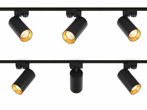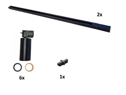 2 pieces 1 phase 2 wire 100cm rail, material aluminum, mounting included, 220-240V, sealing IP20, 1 piece by connector included, product color sand black or sand black and gold with two rings options, 6 pieces rail spots GU10 fixture dim. Ø 60 x 120mm rotatable 350° and tiltable 90°, bulb not included, the rail can easily be cut to the desired length, suitable for indoor use, SKU 1084 SKU 1088 SKU 817