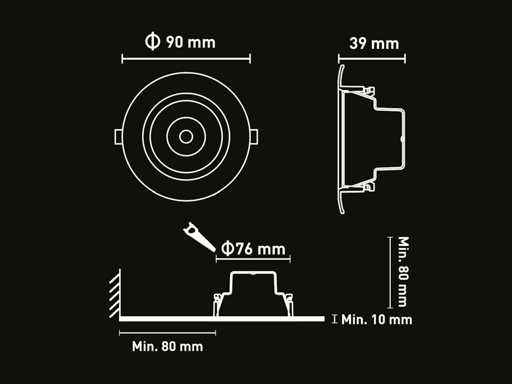 Light flux 365 lumens, light color daylight 6000K, radiation angle 38°- product color matte white, round fixture tiltable, dim. ø 90 x 39 mm, material PC and plastic, mounting set not included, installation diameter ø76 mm, lifespan 15,000 hours, voltage 220-240V, SKU 1157