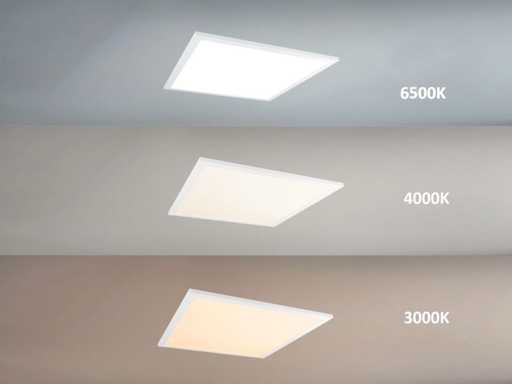 luminous flux 4400-4800 lumens, fliker-free, light color 3 in 1 CCT switch warm white neutral white and daylight that the color temperature can be switched between 3000K 4000K 6500K, sealing IP20, radiation angle 110°, product color matte white, dim. 595 x 595 x 30 mm, material iron and PC, mounting set not included, lifespan 25,000 hours, voltage 220-240V, SKU 1175