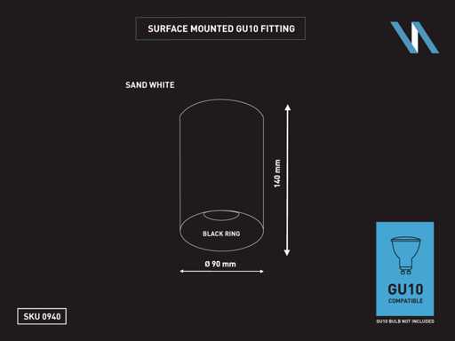 Sealing IP20, product color sand white black, dim. Ø 90 x 140mm, mounting included, material aluminum, fitting GU10, bulb not included, suitable for indoor, one bulb input, voltage 220-240V, SKU 0940