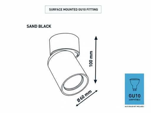 sealing IP20, product color sand black, dim. Ø 60 x 100mm, rotatable 350° and tiltable 50°, material aluminum, mounting included, fitting GU10, bulb not included, suitable for indoor, one bulb input, voltage 220-240V, max 40 watt, SKU 00945