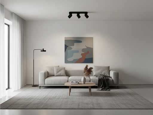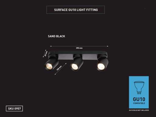 sealing IP20, product color sand black, dim. Ø 60 x 100mm, dimensions wall holder 390 x 60 x 25mm, rotatable 350° and tiltable 50°, material aluminum and iron, mounting included, fitting GU10, bulb not included, suitable for indoor, 3 x bulb input, voltage 220-240V, max 40 watt, SKU 00957