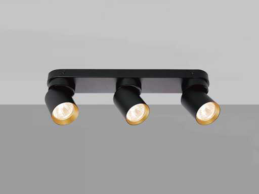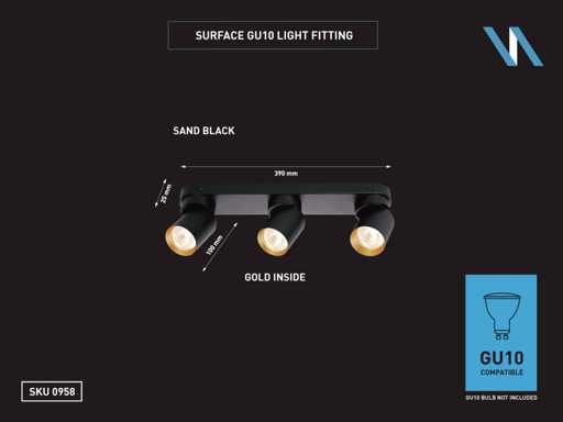 sealing IP20, product color sand black and gold ring, dim. Ø 60 x 100mm, dimensions wall holder 390 x 60 x 25mm, rotatable 350° and tiltable 50°, material aluminum and iron, mounting included, fitting GU10, bulb not included, suitable for indoor, 3 x bulb input, voltage 220-240V, max 40 watt, SKU 00958