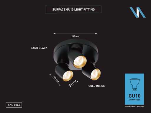 sealing IP20, product color sand black and gold ring, dim. Ø 60 x 100mm, dimensions wall holder Ø 200 x 25mm, rotatable 350° and tiltable 50°, material aluminum and iron, mounting included, fitting GU10, bulb not included, suitable for indoor, 3 x bulb input, voltage 220-240V, max 40 watt, SKU 00962
