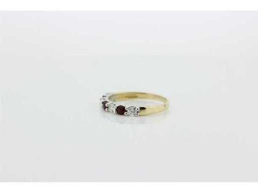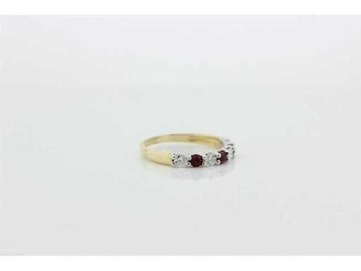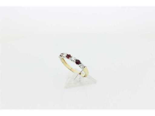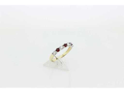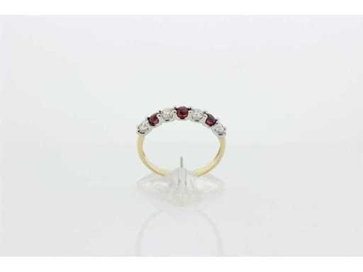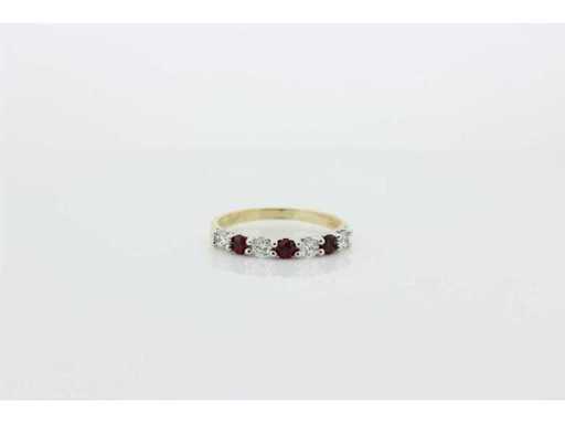 New and unused. 14 carat bi-color half alliance set with 3 natural rubies with a weight of 0.36 ct, and 4 brilliant-cut diamonds with a weight of 0.32 ct. Colour G and quality VS. Includes a ring box and a valuation report with an insurance value of € 1875,-- issued by a qualified appraiser.