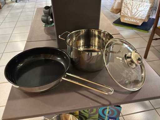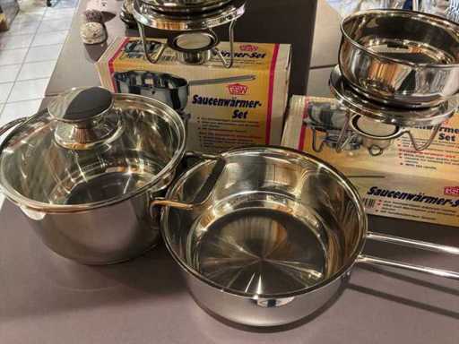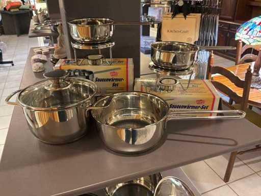 Including 3x cooking pot with lid, 1 x saucepan, 1 x frying pan, sauce warmers with pan..