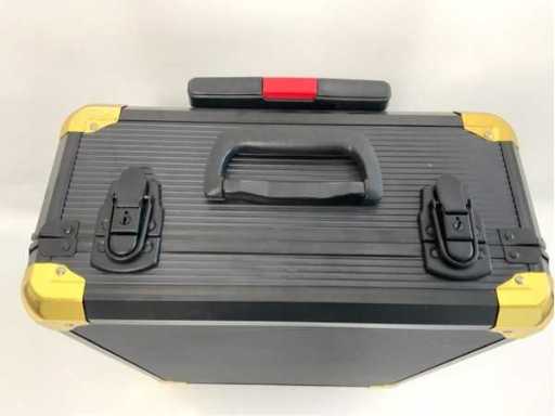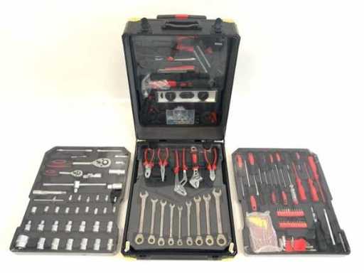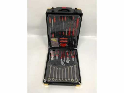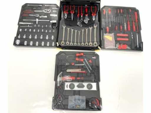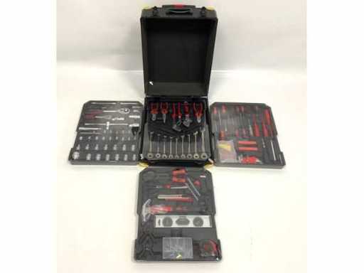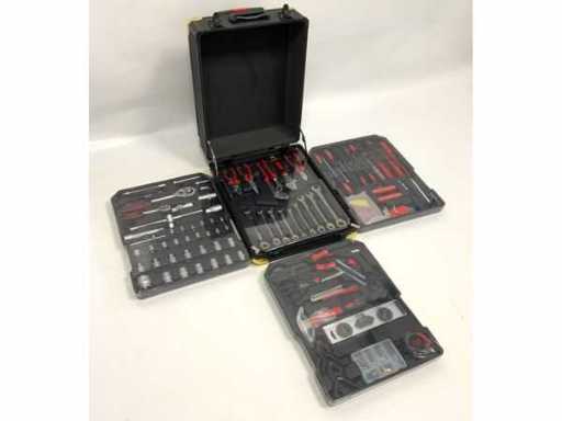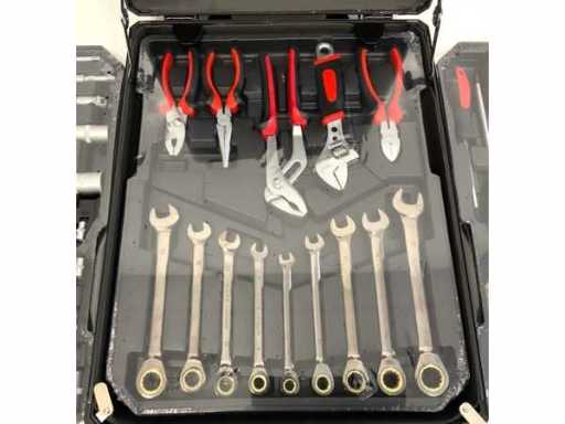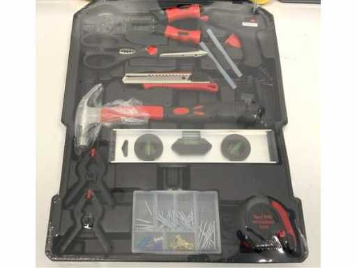 including open-end wrench with ratchet; various pliers; socket set with ratchet; various screwdrivers; precision screwdrivers; Allen key; various bits; claw hammer; crimping pliers; scissors; tape measure; level; hot glue gun; plastic clamps; carpet knife; 2161;