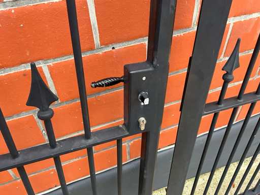Poles 170height x 10thickness Fence size : height 213CM X 4000Cm total of fences without posts Galvanized and powder-coated matte black Keys available Handle broken off on one side