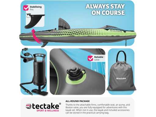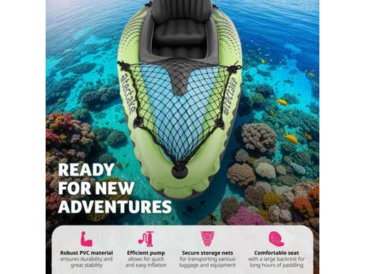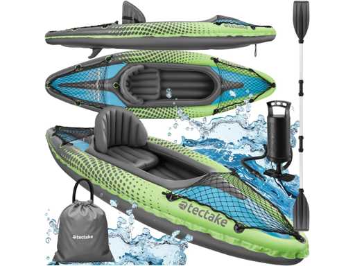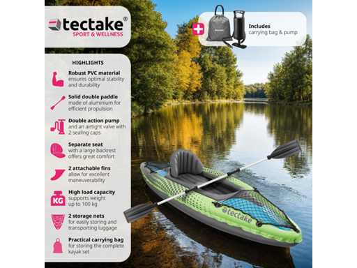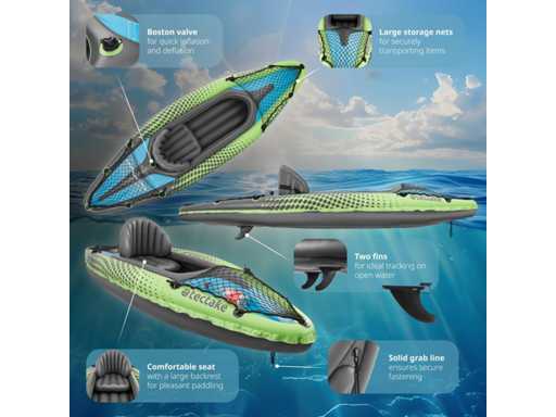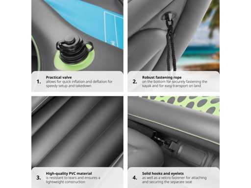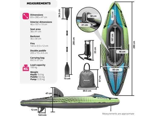 Technical data Load capacity: 100 kg Kayak weight: approx. 9.6 kg Paddle weight: approx. 0.6 kg Pump weight: approx. 0.35 kg Materials: polyvinyl chloride, polypropylene, aluminum, 100% polyester, ABS plastic Size Overall dimensions (W x D x H): approx. 83 x 280 x 47 cm Internal dimensions (W x D x H): approx. 46 x 107 x 19 cm Seat dimensions (W x D): approx. 38 x 41 cm Backrest (W x H): approx. 36 x 30 cm Fins (L x W x H): approx. 14.5 x 0.5 x 12 cm Double Paddle (L x W x H): Approx. 205 x 15 x 4.5 cm Dimensions of the transport net (W x D): approx. 51 x 73 cm Carrying bag (W x H): approx. 69.5 x 57 cm Scope of service Kayak with removable seat 2 removable fins Double Paddle Dual-action pump Carrying bag Instruction Manual