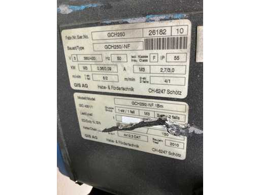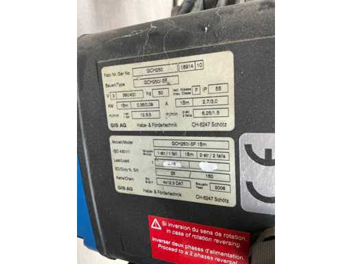 GIS GCH250 series electric chain hoist, robust and compact, designed for industrial lifting of light loads. Check the documentation for 1 or 2 strand configuration.