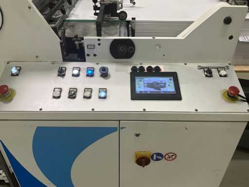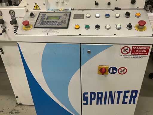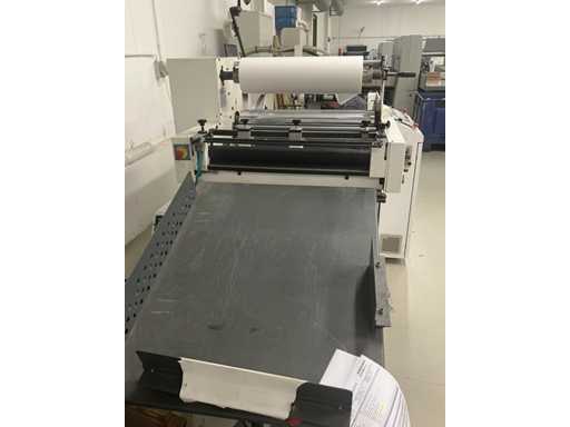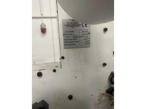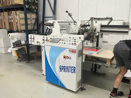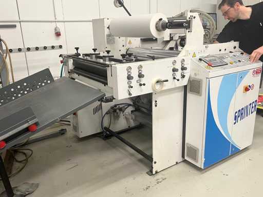 TECNOMAC SPRINTER 3 76 Sheet-to-sheet compact thermal lamination (DRY) machine, 2018 Max. Sheet Size: 760 x 1040 mm, Min. Sheet Size: 210 x 210 mm, Speed: 40m/min High stack feeder, Electronic adjustment of the overlap and length of the sheet, Chrome roller with internal forced circulation of heated fluid, Pressure roller covered with special rubber resistant to high temperatures and pressures, Film trimming device, Unbuckling device Sold in the condition of the photos