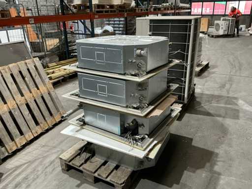 Consists of: 2x largest, 4x small 2x Toshiba Air Conditioning - RAV-SP, RAV-SP1604AT8-E outdoor Unit, R22 and R407C, nominal cooling kW 14.0, nominal heating kW 16.0, standard airflow m3/h 6180, standard airflow l/s 1717, sound power (cooling/heating) dB(A) 68/70, dimensions (H x W x D) mm 1340 x 900 x 320, weight kg 95, power supply V-ph-Hz 380/415-3-50, 4 pieces RAV-SM804UTP-E 4-way cassette, R22 and R407C replacement technology, self-cleaning function, feed pump up to 850 mm, nominal cooling kW 6.7, nominal heating kW 8.0, supply voltage V-ph-Hz 220/240.