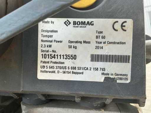 Equipped with: 212 hours, operation unknown, Bomag BT60 rammer (2014) with ±2.3–2.8 kW power, 58 kg weight, 230 mm pitch foot and ±70 mm stroke