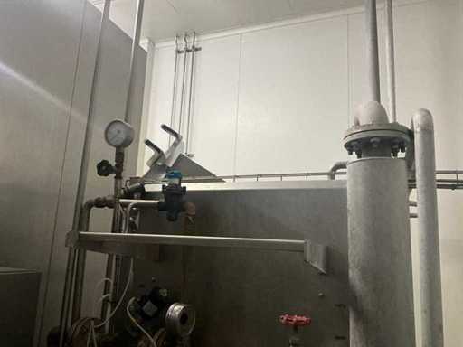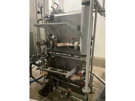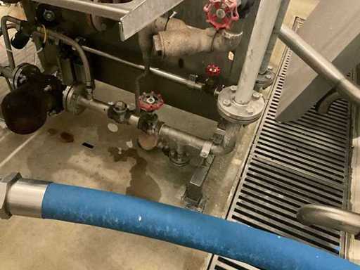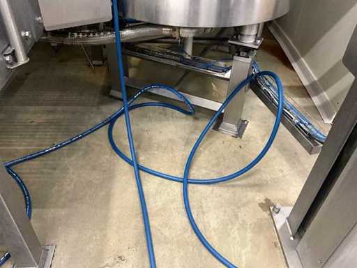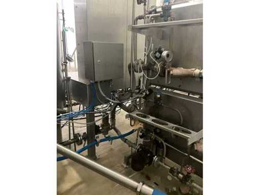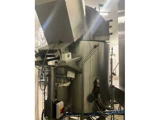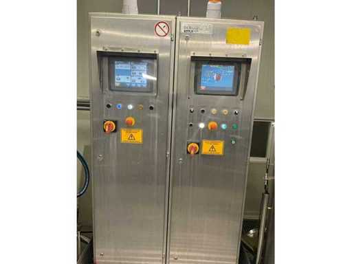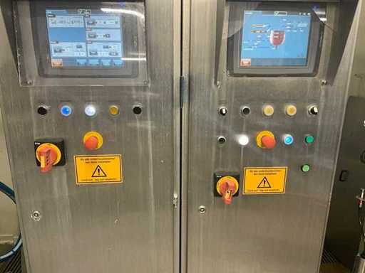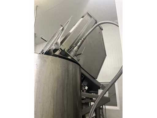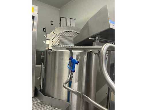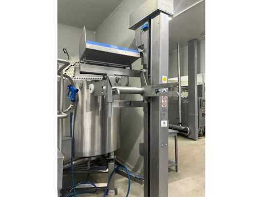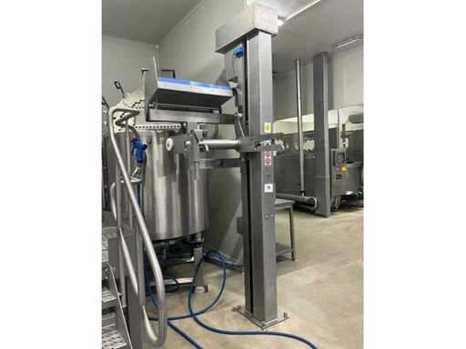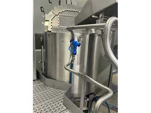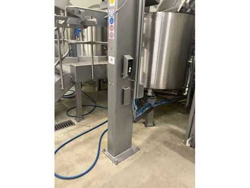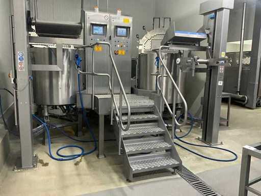 Food processing equipment consisting of 2 large cooking kettles, 2x column loader DCN L25 with feed element, 2 separate control cabinet and work platform with stairs with 4 steps, complete with 2 spray hoses RGB65.