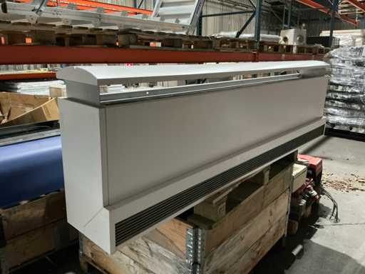 Equipped with: Unit length 2 mtr, door height up to 3.5mtr, electrical supply V/ph/Hz 230/1/50, max. fan output kW 1.15, air inlet temperature °C 20, exhaust air temperature °C 37 (speed 1) 35.5°C (speed 2) 34.3°C (speed 3), air volume m3/h 2345 (speed 1) 2996 m3/h(speed 2) 3754 m3/h (speed 3), heating capacity kW 13.4 (speed 1) 15.7 (speed 2) 18 (speed 3), wall-controler, W4= water heating (4-row), F = free-hanging, DF = doorFlow, supplied with roller grodine, See attached documentation Doorflow.