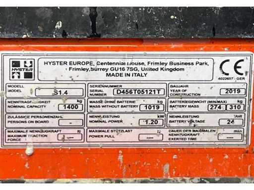 2019 Hyster S1.4 Electric Stacker