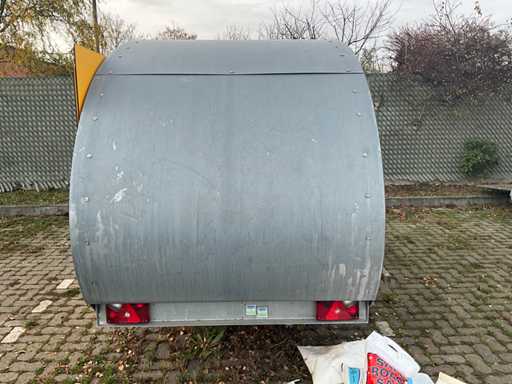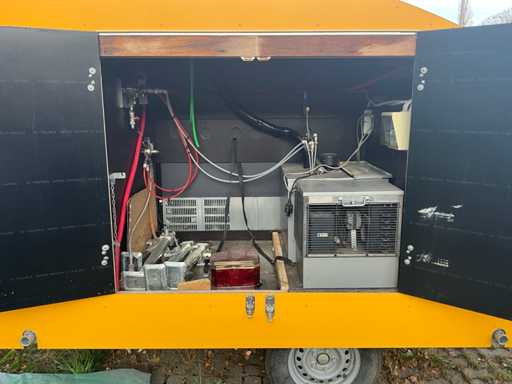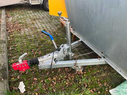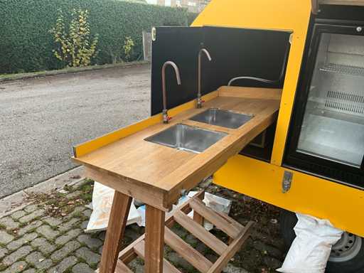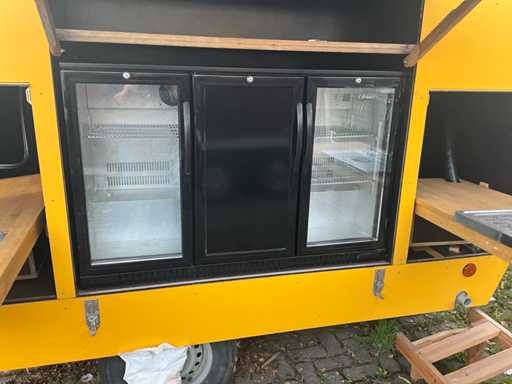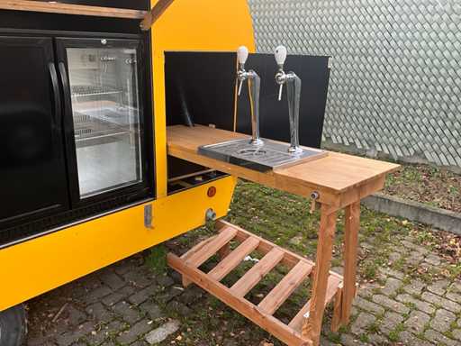 Equipped with double tap installation with cooling, three-door bar cooling with cooling unit, double sink, fully lockable, trailer with overrun brake and support wheel, Belgian on-board documents complete, DRAWBAR LOCK NOT INCLUDED!