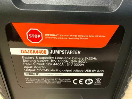 12/24V Dual Voltage; peak 12v 4400A/ 24v 2200A; USB charger; 230v; 50Hz; unused; in packaging;