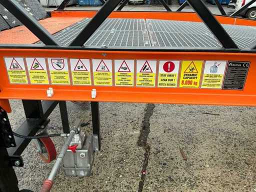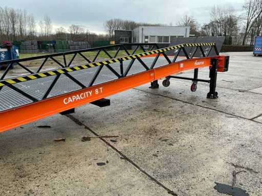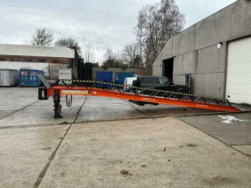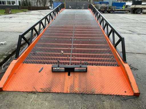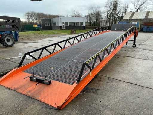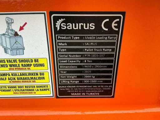 This lot consists of practically unused mobile hydraulic loading ramp of the brand SAURUS, suitable for loading and unloading trucks with pallet trucks and similar internal transport equipment. The loading ramp is made of a robust steel construction and equipped with an anti-slip grid deck, side protection and hydraulic controls. Thanks to the mobile design, the loading ramp can be used flexibly at different locations.