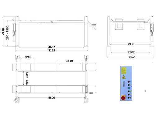 Equipped with rear wheel alignment plates + lane shims, with integrated 2.5 ton air-hydraulic roller jack (TRJ25ALP) and LED lane lighting with protective grilles (LED8P); lanes 4.8 meters long × approx. 50 cm wide; lifting capacity 5 000 kg; maximum lifting height approx. 180 cm; driven by 2.2 kW electric motor (400V, 3-phase); equipped with mechanical locking and automatic release when moving up/down; Front and rear roll-off protection; load-sensing lowering valve; mechanically synchronous via steel cables; Control via control console (24V); manual emergency lowering in the event of a power failure; adjustable lane spacing from 99 to 115 cm (suitable for lifting wheelbase vehicles up to approx. 4.65 m); Lane lighting consisting of 24V LED luminaires with protective grilles, mounted on the sides of the lanes for optimal working lighting.