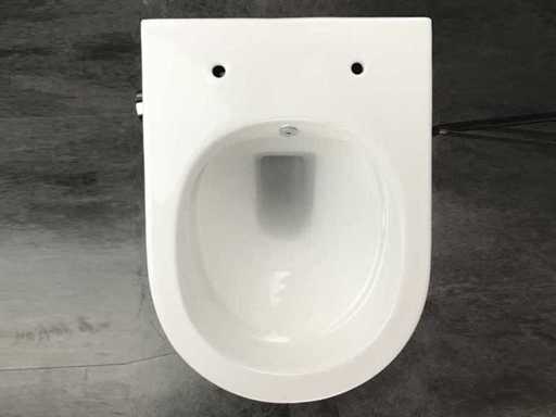 Toilet seat soft close with lid, drain P-trap, weight 30 kg, toilet is cast and glazed and later hardened in the oven making it very scratch resistant, equipped with water flush with hot/cold control knob and hot and cold water connection, rimless flushing (no flushing rim), complete with mounting material and connection water hoses, universally applicable to any built-in reservoir, Quick release lid