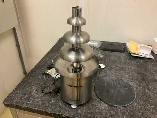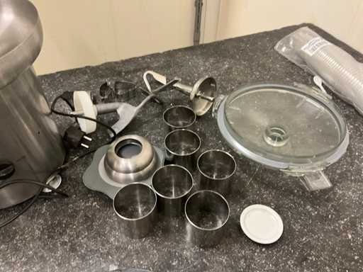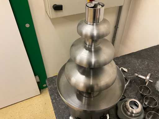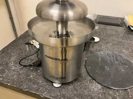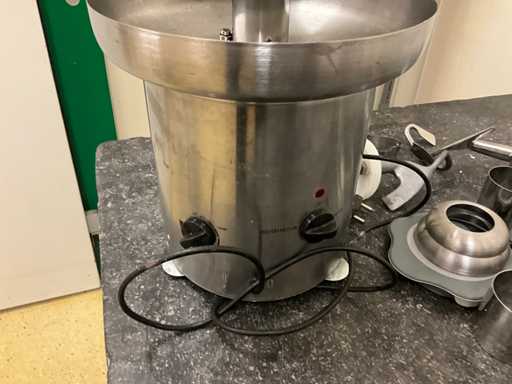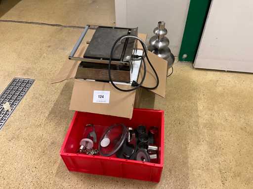 3 various stainless steel kitchen appliances including pancake maker POPCAKE WT-10-IT (in packaging), grill ELECTROLUX DITO, chocolate fountain LENTZ CHOCOKING and some accessories as visible on photo