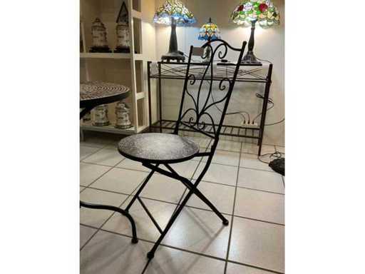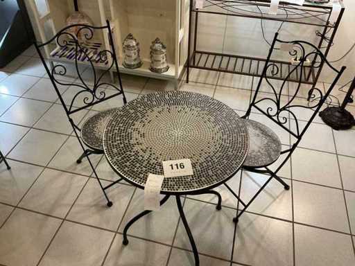Table with metal base and mosaic top with dimensions approximately 60 x 73 cm complete with 2x metal garden chair with mosaic seat.