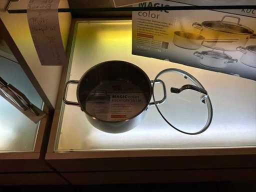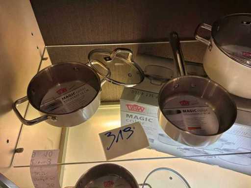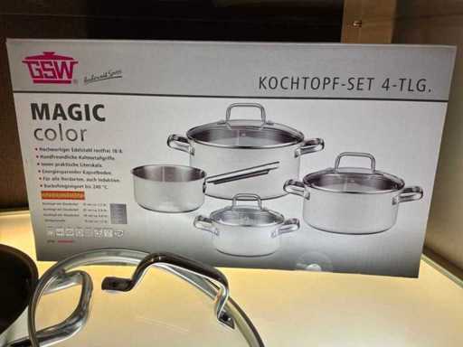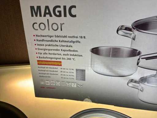 Consisting of 1x cooking pot (diameter 24 cm) with glass lid, 1x cooking pot (diameter 20 cm) with glass lid, 1x cooking pot (diameter 16 cm) with glass lid, 1x saucepan (diameter 16 cm)