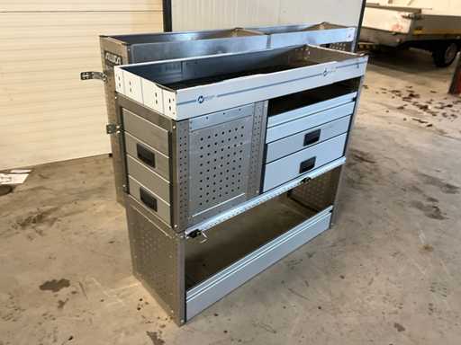 Consisting of 2x cabinet, dimensions approximately: 42x119x106 cm and 32x199x105 cm, equipped with assortment bin storage system.