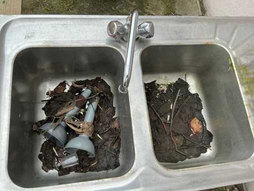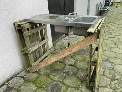 Equipped with 2 sinks and mixer tap, total dimensions setup approximately 135 x 70 x 107 cm