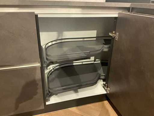Dimensions left part approximately 307x60x90 cm; dimensions right part approximately 246x60x170 cm; kitchen must be dismantled on site; without content and accessories