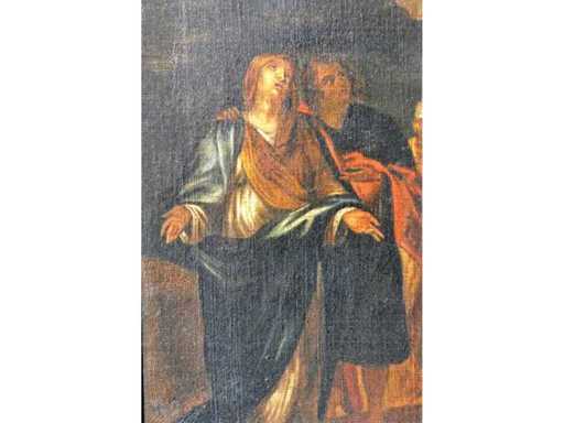 Religious representation of the crucified Christ. Classic academic style with strong contrasts of light and dark. The canvas shows a tear (see detail photo), traces of age and use.