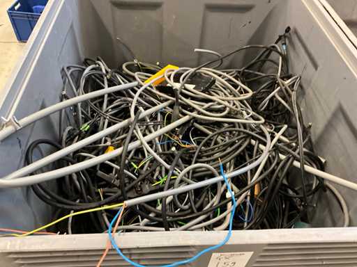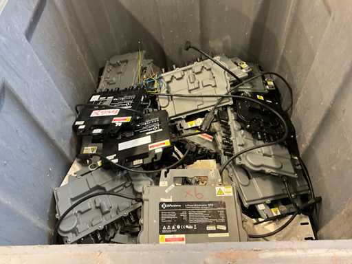 Consisting of cable, fuse boxes, solar panel inverters. Includes 4 plastic bins.