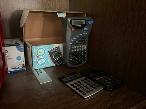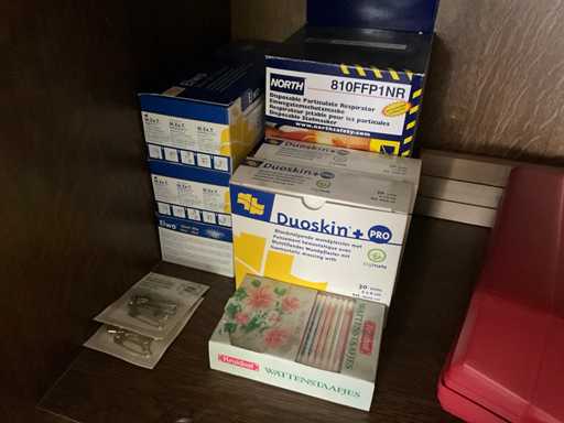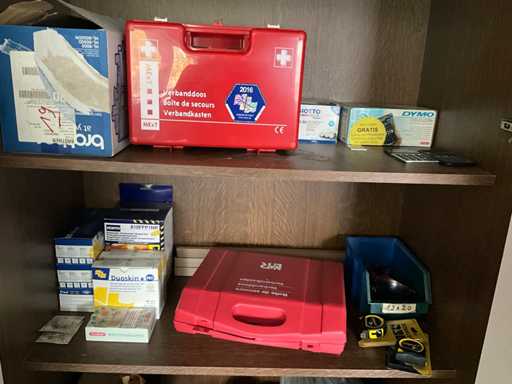 2 first aid kits, various mouth masks, 1 label printer DYMO and 3 various safety helmets.