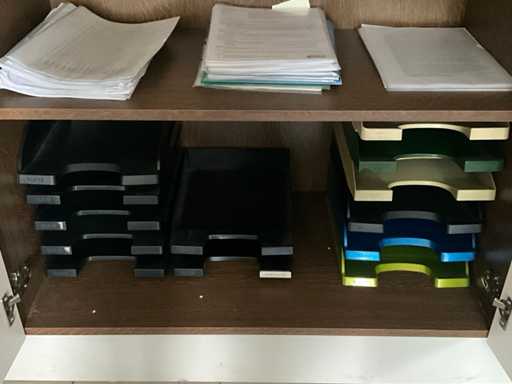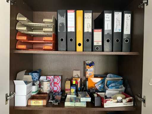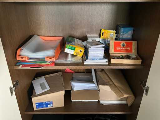 Including various writing utensils, folders, sorting trays, post-its, tape, stapler, staples, envelopes,