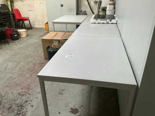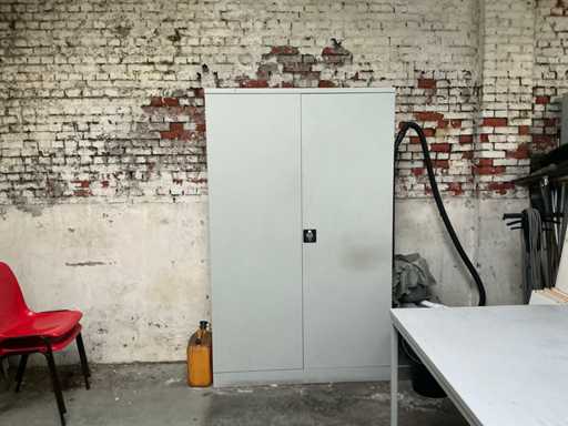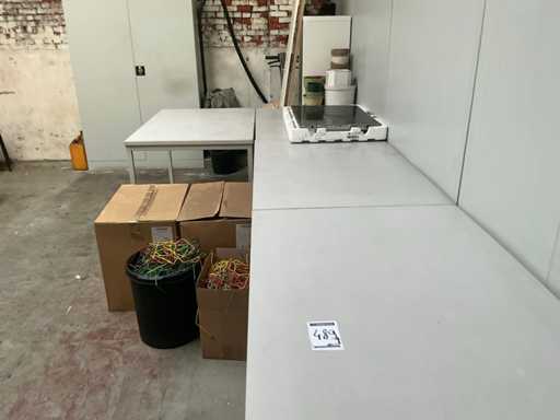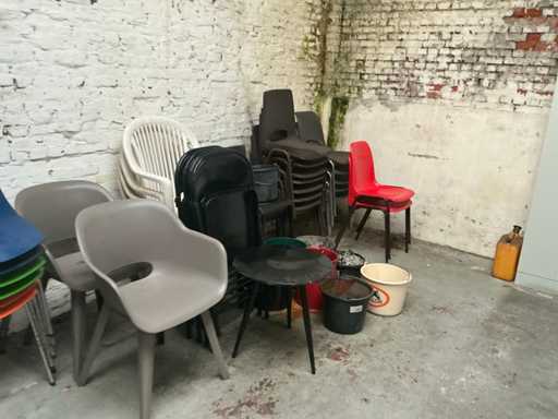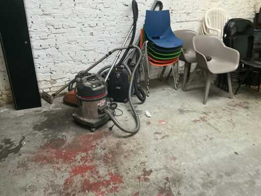 Including: 4 various tables, 4 old vacuum cleaners, 1 metal 2-door filing cabinet, various chairs