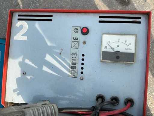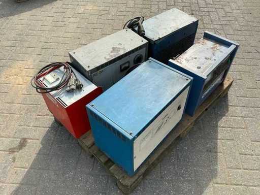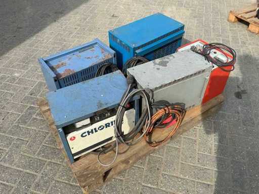 Equipped with: 5 different battery chargers for forklift, see photos for brand and models.