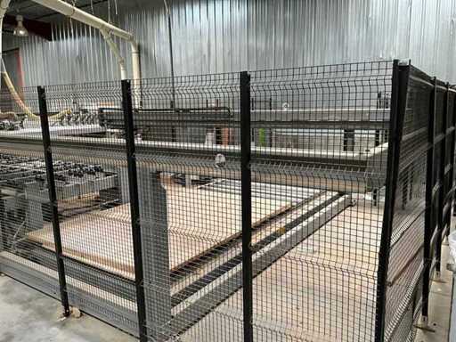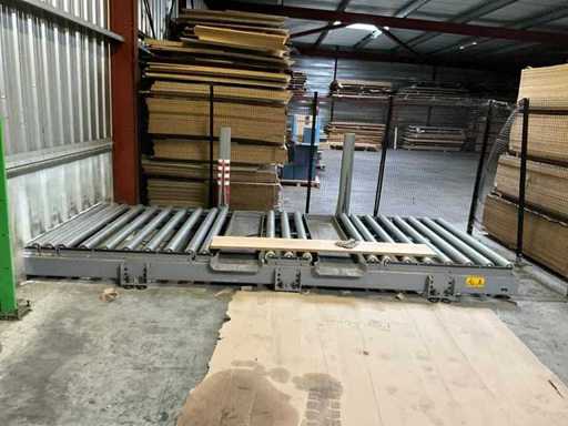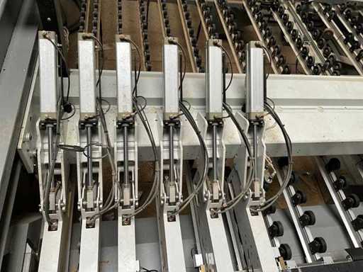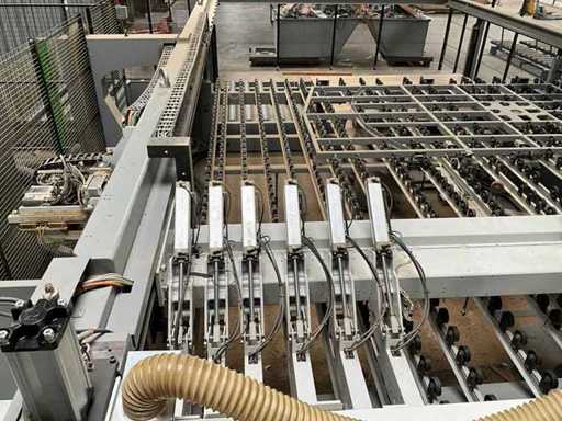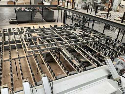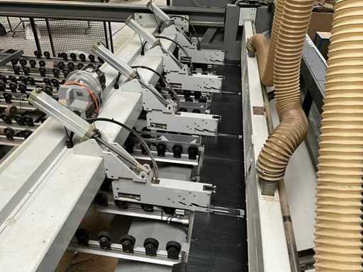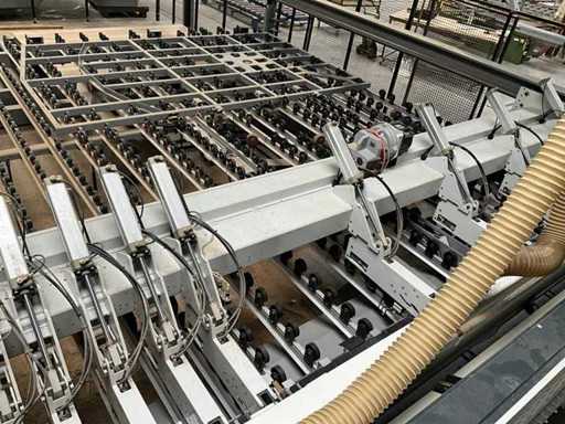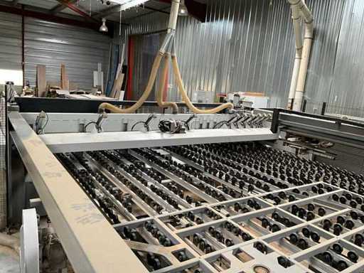 BIESSE SELCO WNTR 730 horizontal panel cutting centre, with roller conveyor loading area. All technical data is taken in photos so that you can consult them. Sold with safety mesh and ATLAS 1000kg capacity elevator exit conveyor