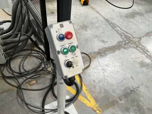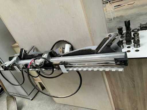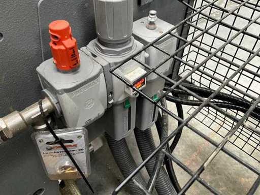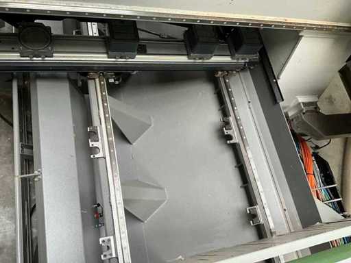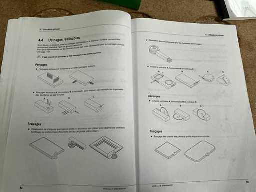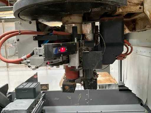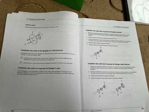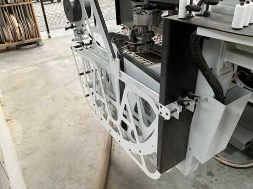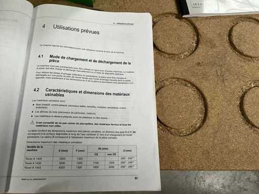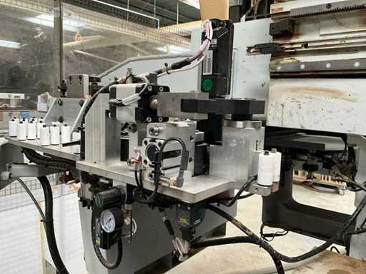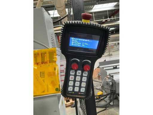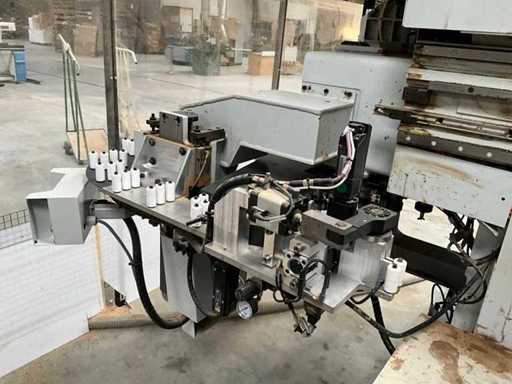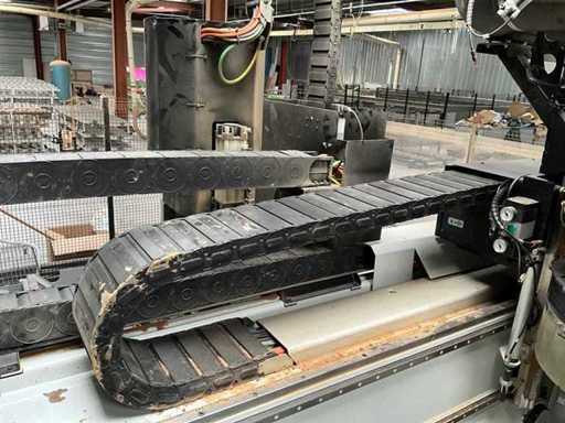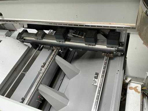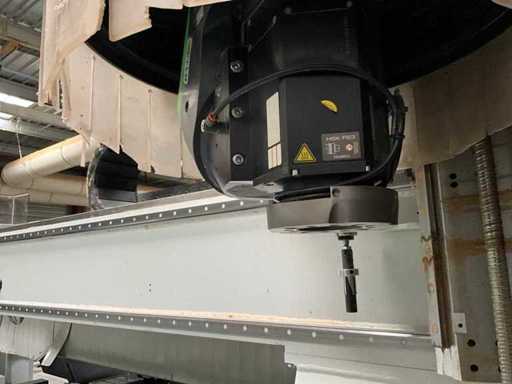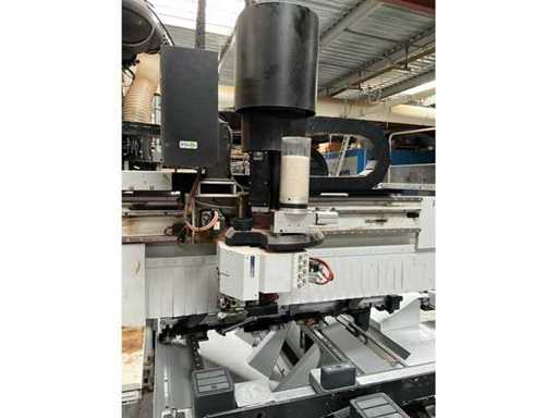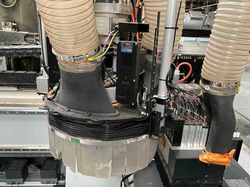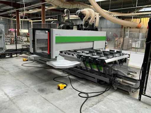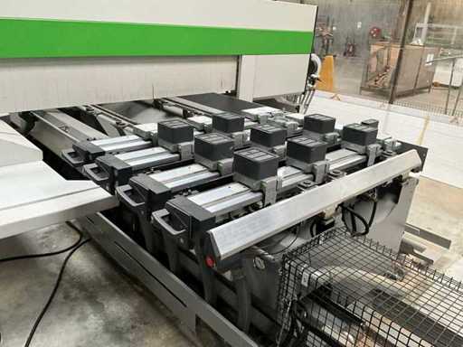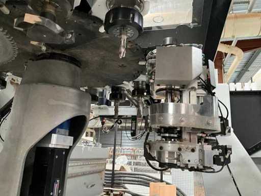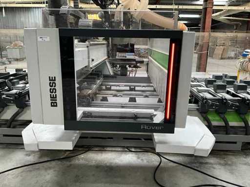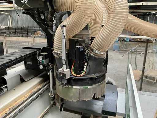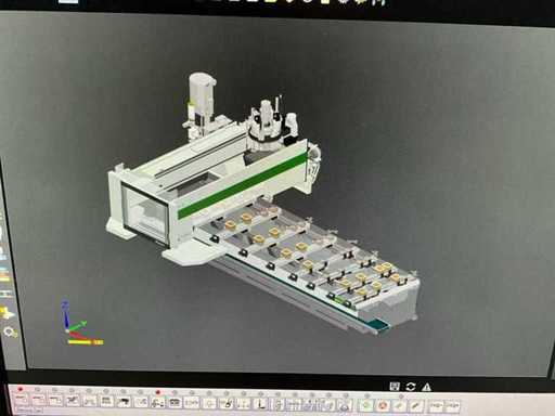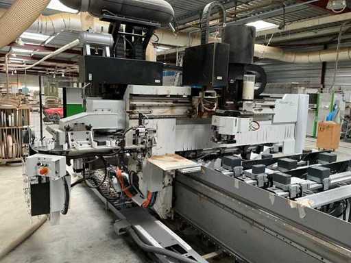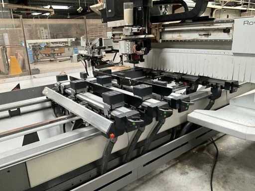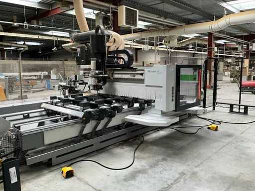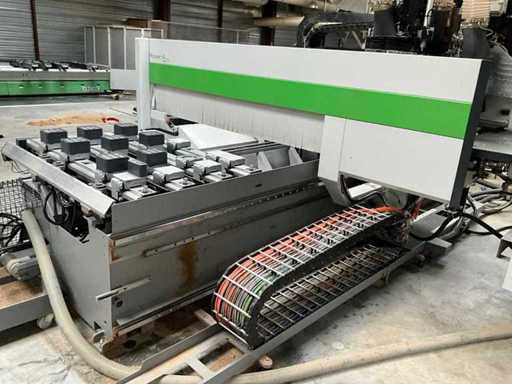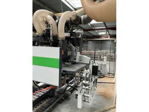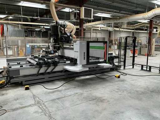 5-axis machining center with integrated edge banding from BIESSE. This machining center can work workpieces with maximum dimensions of X:4320mm Y:1620mm Z:200mm. The maximum speeds are: X: 83 m/min Y: 60 m/min Z: 20-30 m/min depending on drilling or milling type The compatible pin types are identified in the technical documentation which is pictured. the set is sold with the BUSCH type MM 1252 A VV3 vacuum pump with a maximum capacity of 290 m3/h. The set is sold with protective grilles, protective beam barriers, furniture with contents.