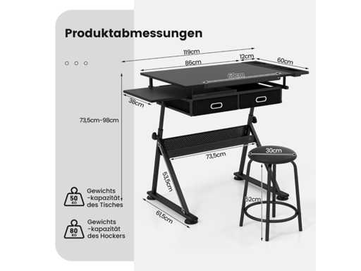 The desk top supports up to 50 kg, the chair up to 80 kg.