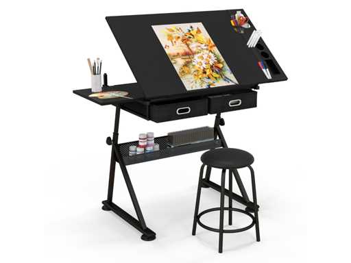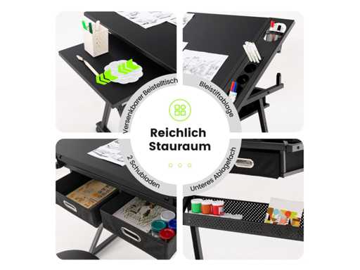 Two practical fabric drawers and a metal box for sketches or paintings.