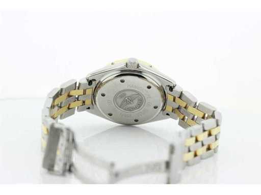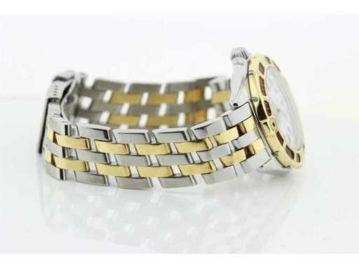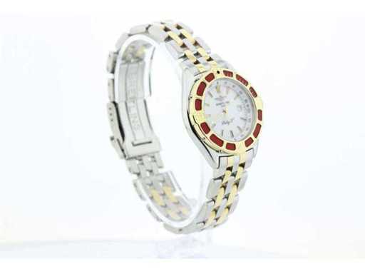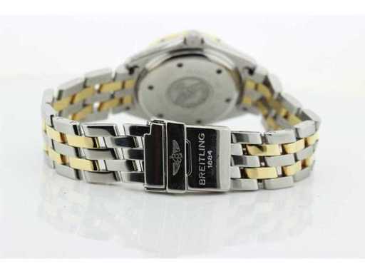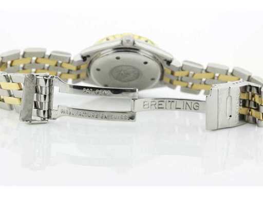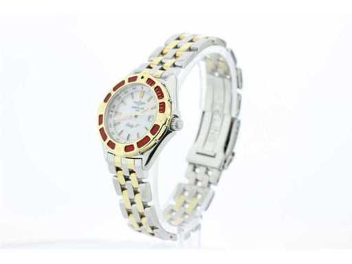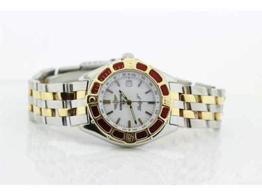 Breitling Lady J women's wristwatch with white dial and gold/steel pilot band. Gold rotating bezel with red inlay,. We expressly guarantee its authenticity, and you can have it verified with a Breitling retailer.