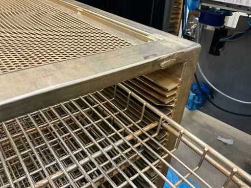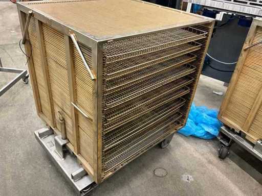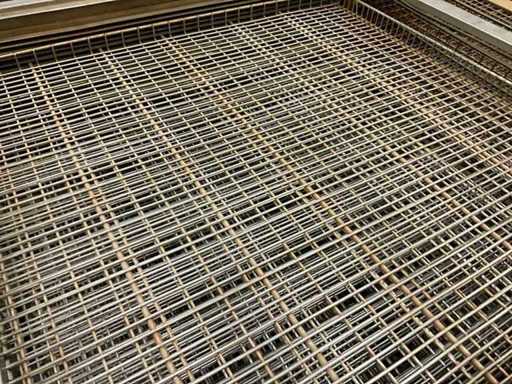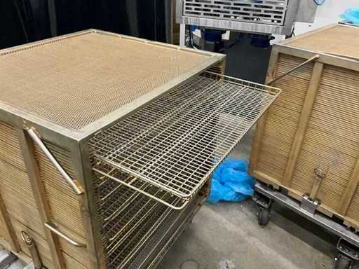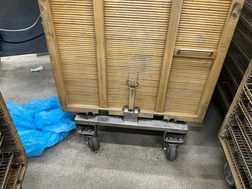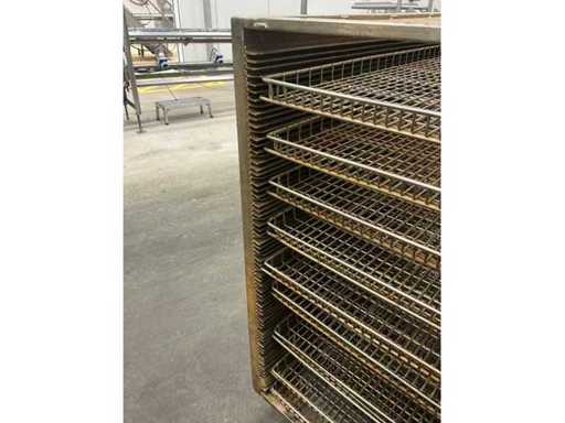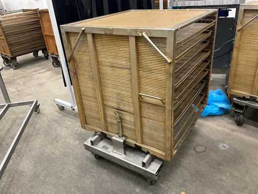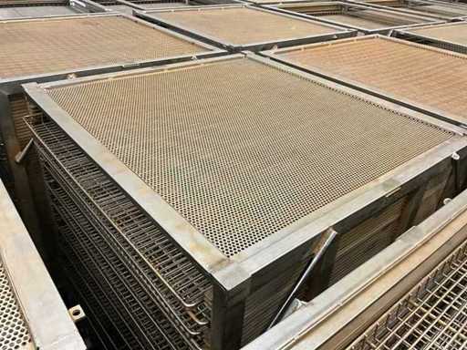 Metal platform trolley containing a minimum of 10 different grid trays, each approximately 82 x 80 x 3.5 cm high, in various motives. This cart is equipped with a fixed roasted top! Size of each trolley: 86 x 82 x 115 cm. high. Equipped with 2 swivel wheels and 2 fixed wheels.