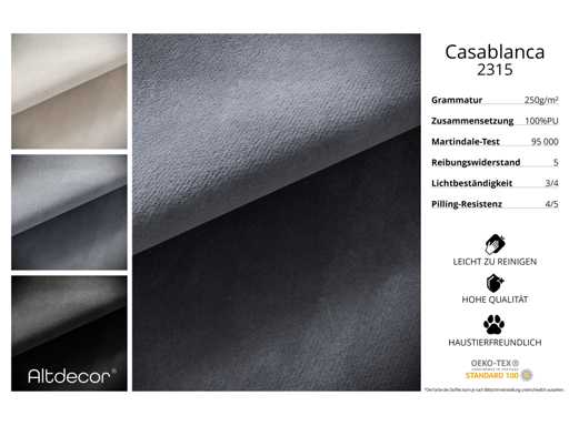 Fabric Description Casablanca Upholstery Fabric: "Pet Friendly", Easy to Clean (CleanBOO+), Water Lotus Repellent, Abrasion Resistant (45,000 Martindale Cycles), Weight 310 g/m² ±5%