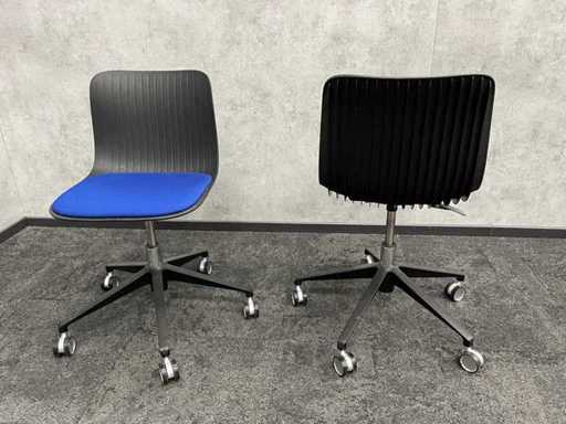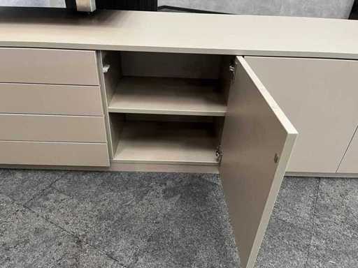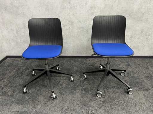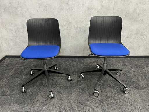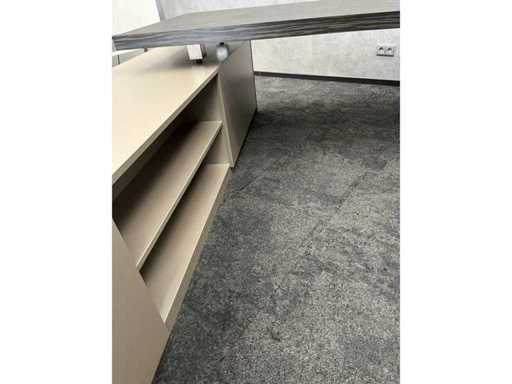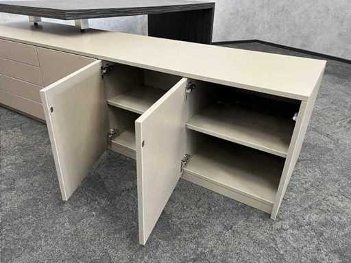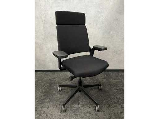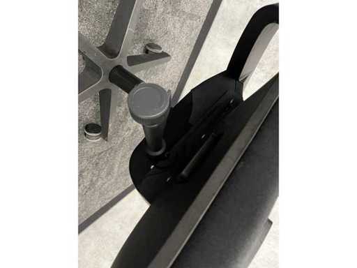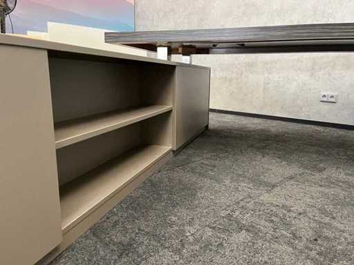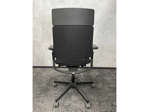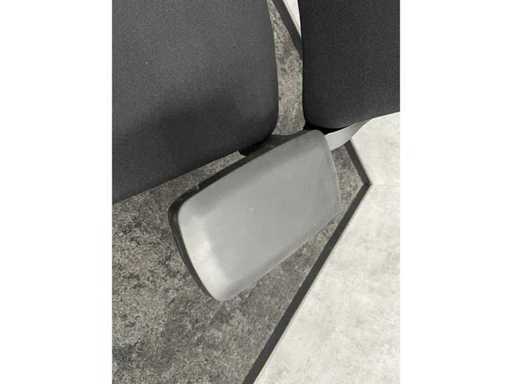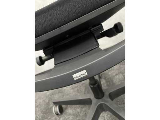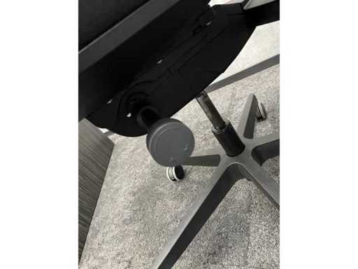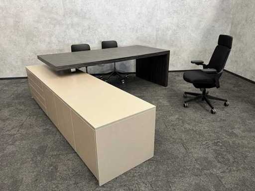 lot consisting of Interstuhl ergonomic office chair v.v. 3D adjustable armrests, seat height and seat depth adjustable, headrest and active sitting. --- 2x Segis Dragonfly mobile conference chair. Mobile, height-adjustable and rotatable --- executive desk with cabinet. Dim. Desk top approx. HxWxD 75x220x100 cm. Dim. Cabinet approx. hxbxd 59x260x64 cm. (cabinet and desktop are separate from each other and unpackaged).