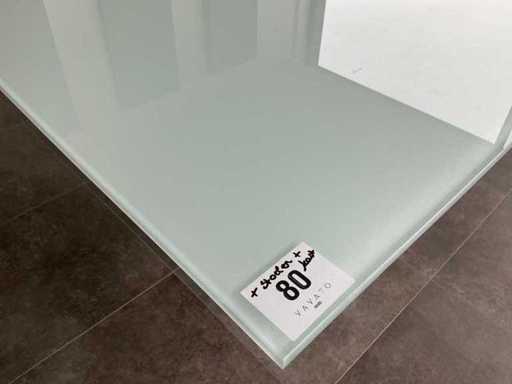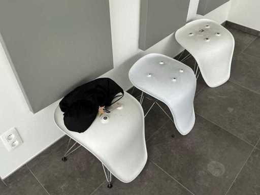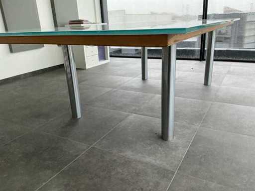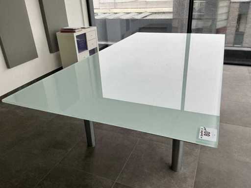 Equipped with glass top and metal base. Complete with 3x disassembled chair and storage cabinet with dimensions approx. 80 x 40 x 80cm.