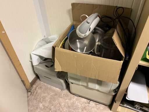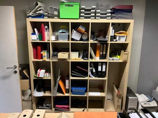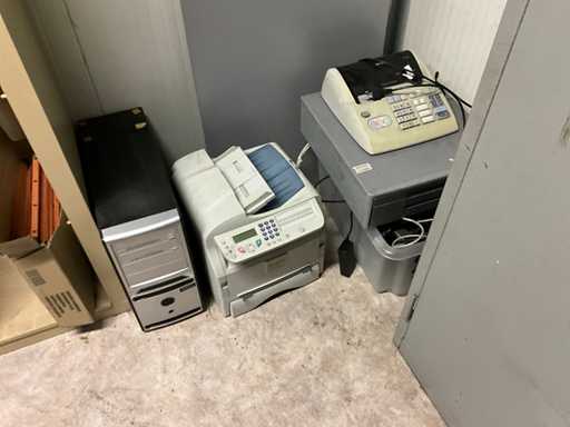 Consisting of wooden corner desk 1850x1850 mm, side table 1x1 meter, 1x sheet steel two-door filing cabinet without content, 1x wooden compartment cabinet 1850x1850 mm with contents, batch of kitchen utensils and printers, +1x one+two-seater sofa brown leather look, accounting STAYS ON SITE!!