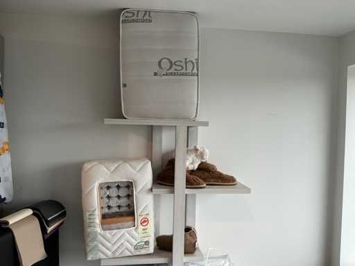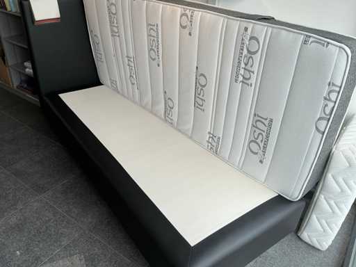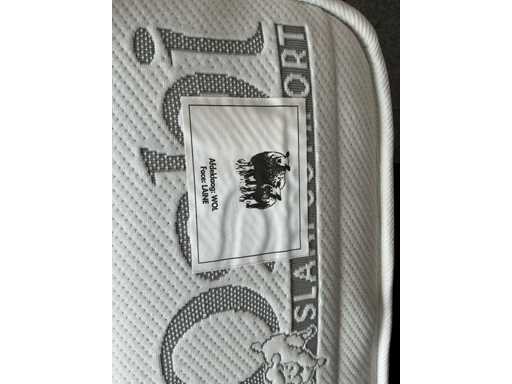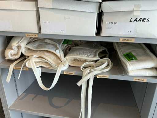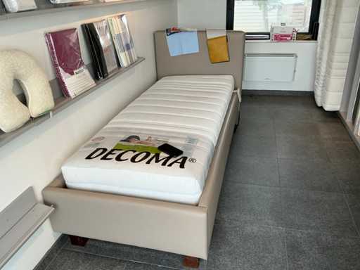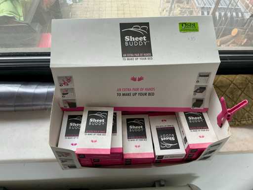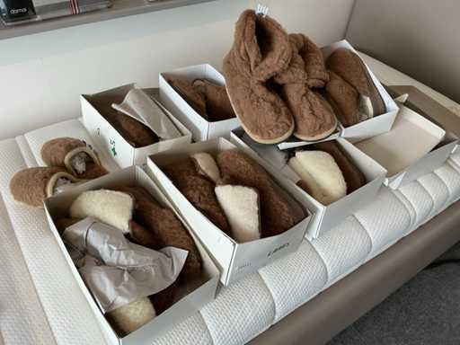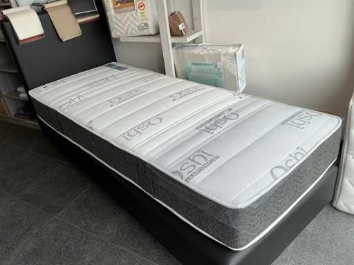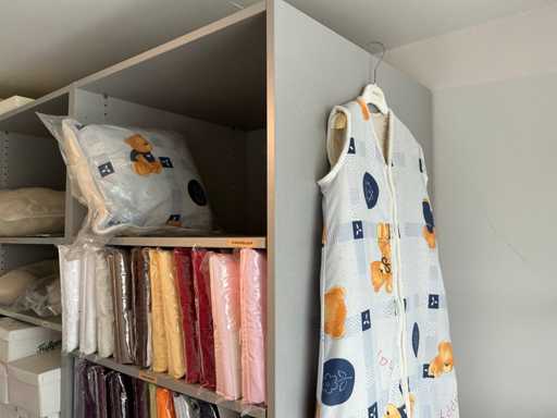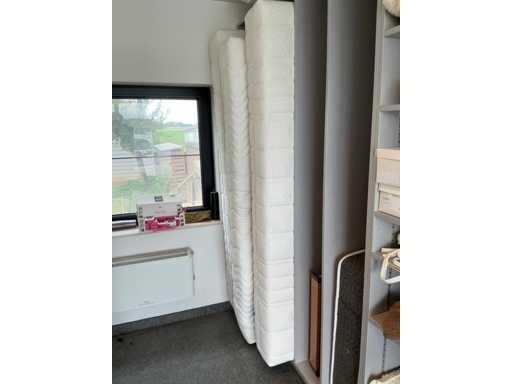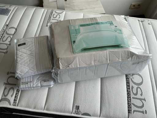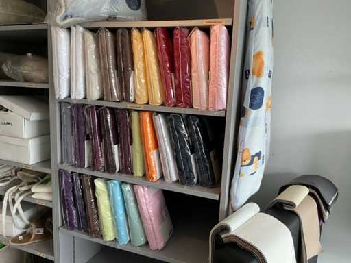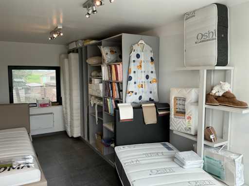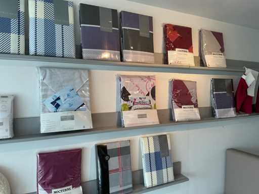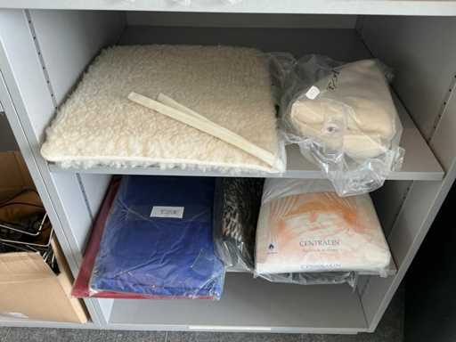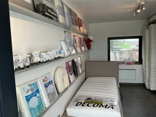 Store contents: 1 box spring 200cmx80cm, 1 bed with electric adjustable slatted base 200cmx90cm, 5 various mattresses (1 person), 14 duvet covers in various sizes and qualities, 29 fitted sheets in various sizes and colors, 1 duvet with pillowcases, 2 mattress protectors, 9 pairs of various slippers in various sizes, batch of various items in wool including shoulder straps, neck straps, pillows, batch of mattress samples, Box Sheet Buddy.